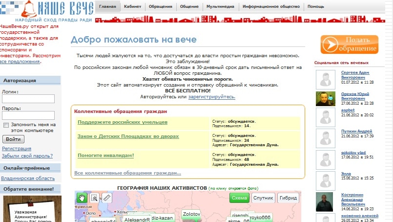 Создатели проекта и граждане РФ активизируют деятельность органов власти и помогают улучшить их работу с обращениями пользователей. «Наше Вече» – это сообщество пользователей, объединенных желанием решить свои локальные проблемы или пролоббировать более масштабные вопросы (такие, например, как обеспечение инвалидов техническими средствами реабилитации).