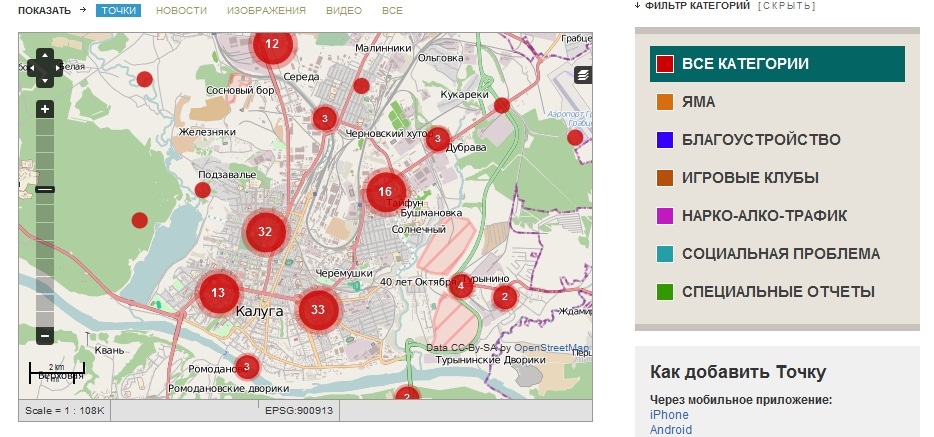 «Общественная Карта проблем Калуги и области» – это картографический сервис на платформе Ushahidi. Точками на карте отмечены проблемные регионы, новости, видео, изображения.