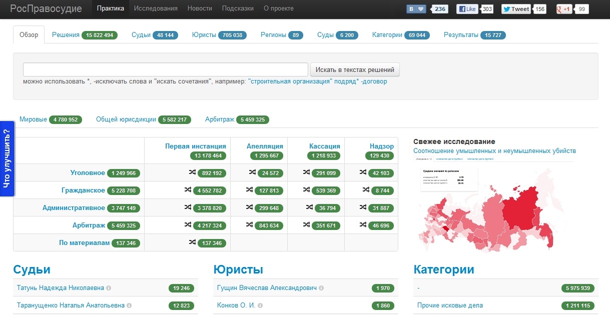 Г.С.: Прежде всего, это база данных. Судьи, адвокаты, судебные решения – не вся информация по этим категориям существует в открытом доступе. Наш проект предоставляет пользователю реальный механизм поиска данных в рамках судебных решений и сопутствующей информации. Работа системы устроена достаточно просто – сначала в нее загружается информация о судебных решениях, индексируется и разносится по соответствующим категориям.