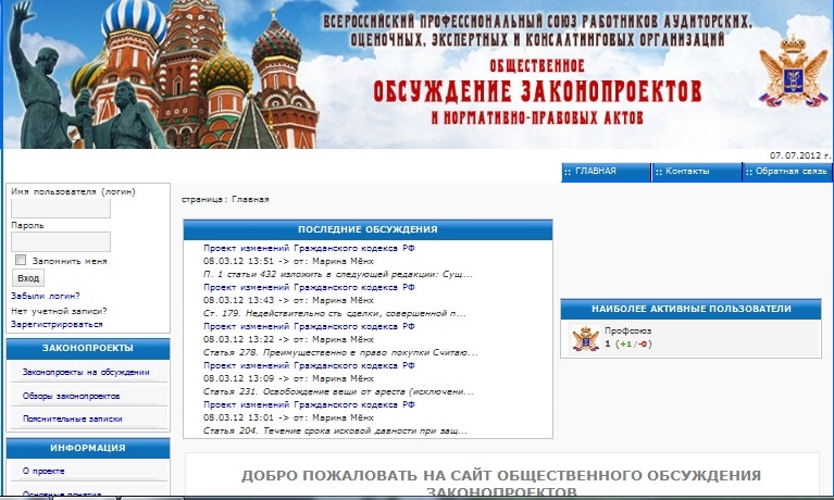 «Общественное обсуждение законопроектов» – инициатива Всероссийского Профсоюза работников аудиторских, оценочных, экспертных и консалтинговых организаций. Это площадка для интерактивного обсуждения значимых законопроектов, принятых на рассмотрение Государственной Думой Федерального Собрания РФ.