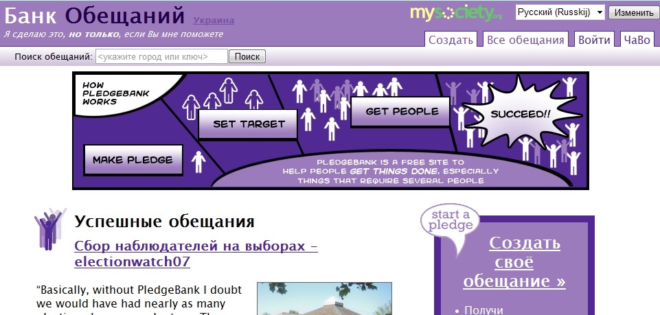 «Банк Обещаний» (Pledge Bank) – это копилка идей и предложений пользователей, которые не смогут реализоваться, пока их не поддержат другие люди.