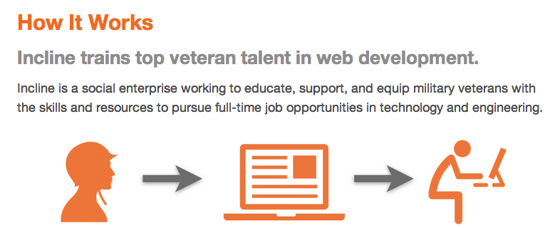 Около 220 000 бывших американских военнослужащих – ветеранов Афганистана и Ирака – сейчас безработные. Около 1000 000 человек вернётся со службы в течение ближайших 5 лет. Для того, чтобы помочь им трудоустроиться, был запущен проект Incline – бесплатная школа IT и сервис по поиску работы.