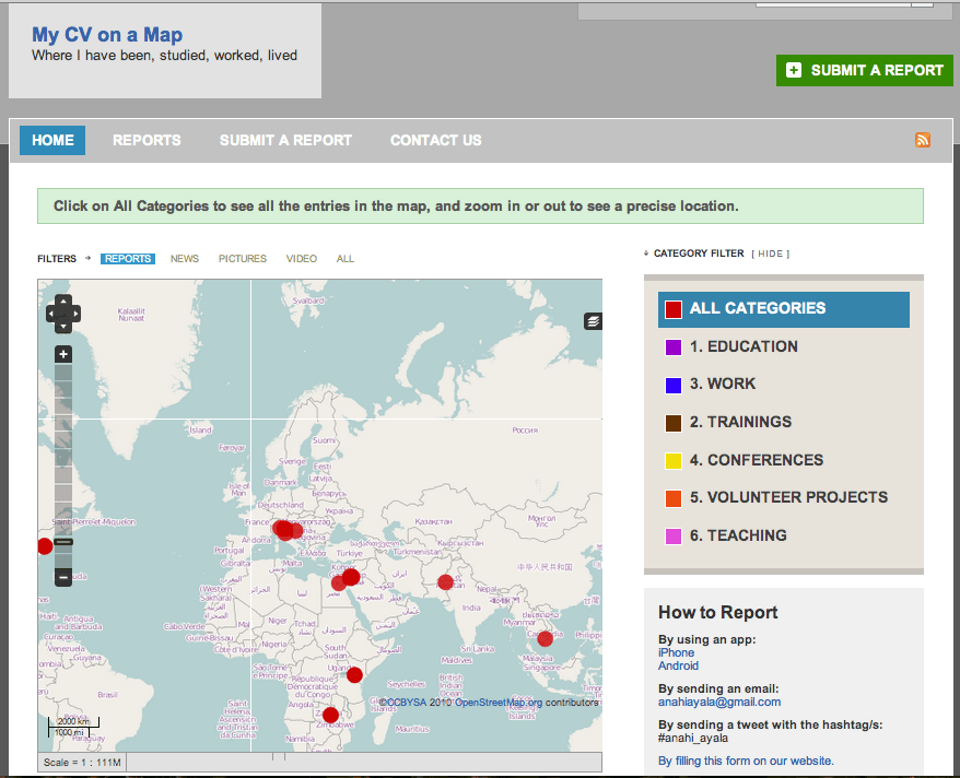 Использование платформы Crowdmap (бесплатной краудсорсинговой платформы) — отличная идея для визуализации CV. Тем более, к каждой локации можно добавить файлы, ссылки на видео с мероприятий, материалы СМИ. Конечно, это особенно привлекательно для активистов, часто участвующих в международных и региональных событиях.
