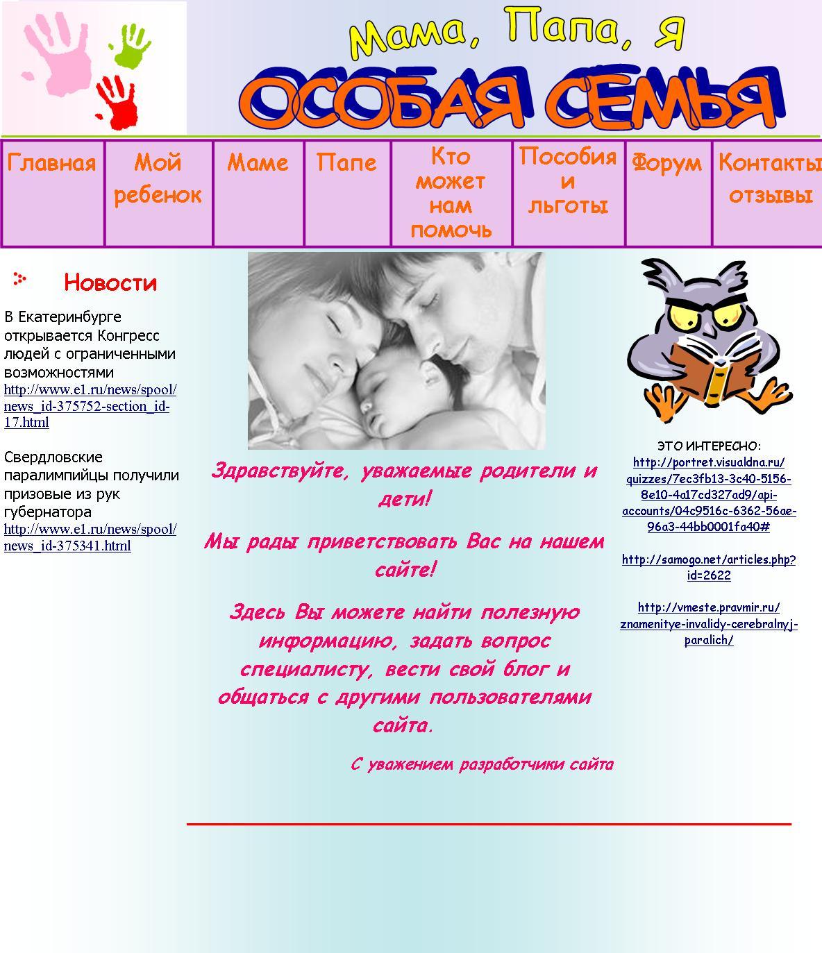 - раздел «Кто может нам помочь?» содержит информацию о различных государственных учреждениях, в которые могут обратиться особые семьи. Можно задать вопрос специалисту.