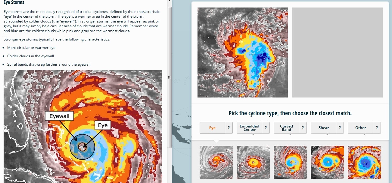 Короткий курс подготовки расскажет об интерфейсе приложения. В принципе, все очень просто и понятно. Первым делом, нужно определить тип циклона на основе расположения его центра, температуры облаков вокруг это центра, так называемого “глаза” циклона и других отличительных особенностей, о которых доступным языком рассказано во вспомогательных окошках. После того, как идентифицирован тип циклона, необходимо выбрать из предоставленных снимков тот, что больше остальных похож на первоначальный образец.