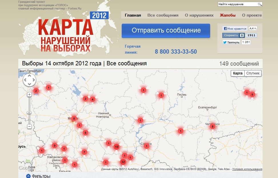 «Карта нарушений на Выборах» – отличный пример конструктивных самостоятельных действий граждан, направленных на защиту их конституционных прав. Проект предусматривает сбор статистики по электоральным нарушениям любого характера на всей территории РФ, а также возможность оформления жалоб в соответствующие органы и проведение независимых журналистских расследований сотрудниками информационных служб.