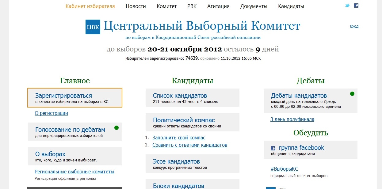 20 и 21 октября должны состояться выборы в Координационный совет российской оппозиции – представительный орган, призванный, по мнению создателей, объединить протестное движение и снабдить его легитимными, избранными лидерами. На сайте ЦВК каждый желающий может ознакомиться со списком кандидатов, выяснить их позицию по актуальным вопросам и проголосовать за понравившихся политиков.