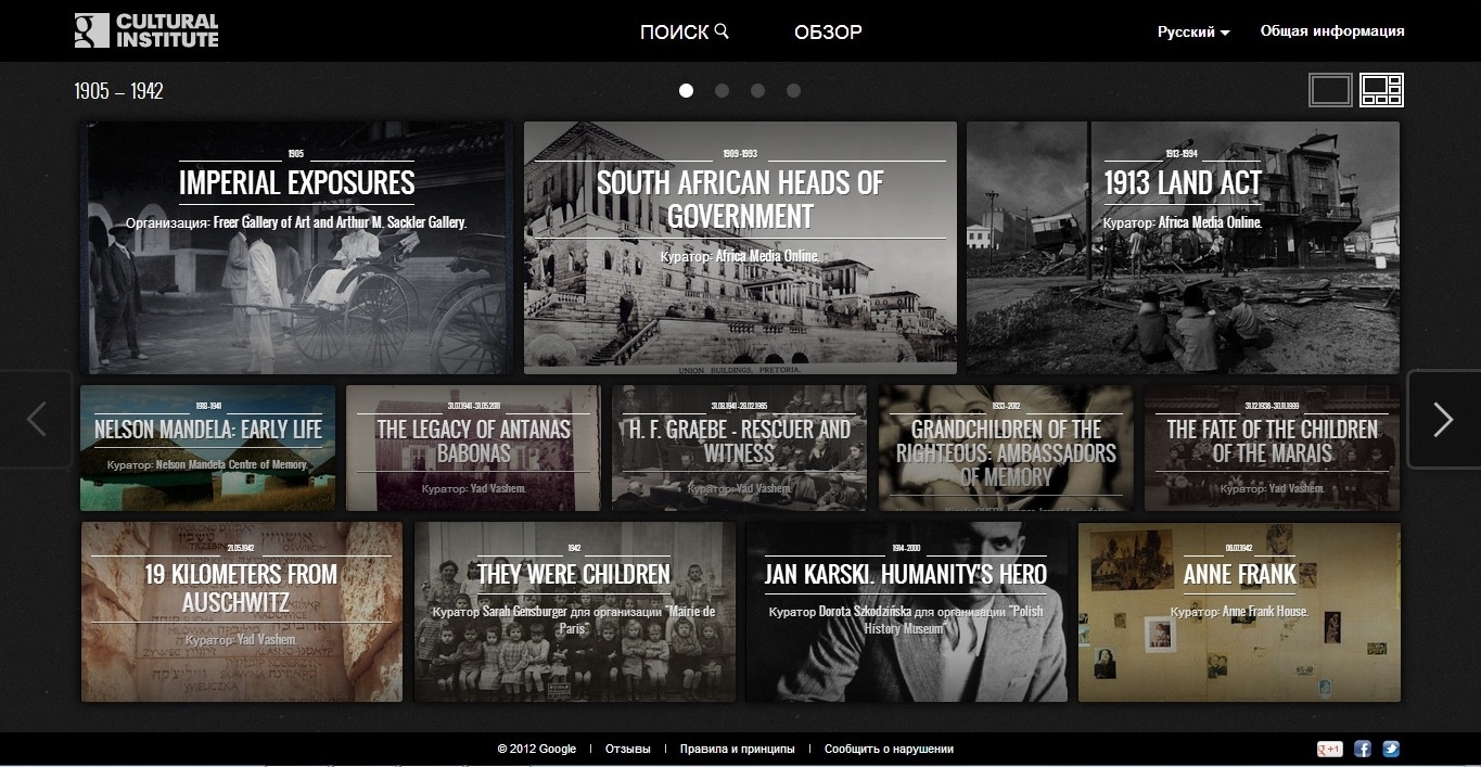 Недавно в рамках Института Культуры было объявлено об открытии сорока двух новых виртуальных выставок, рассказывающих о ключевых исторических события двадцатого столетия. В создании виртуальных историй Институту помогали 17 музеев и фондов. Некоторый предоставленный ими материал, включая фотографии, манускрипты и письма, появляется в Сети впервые.