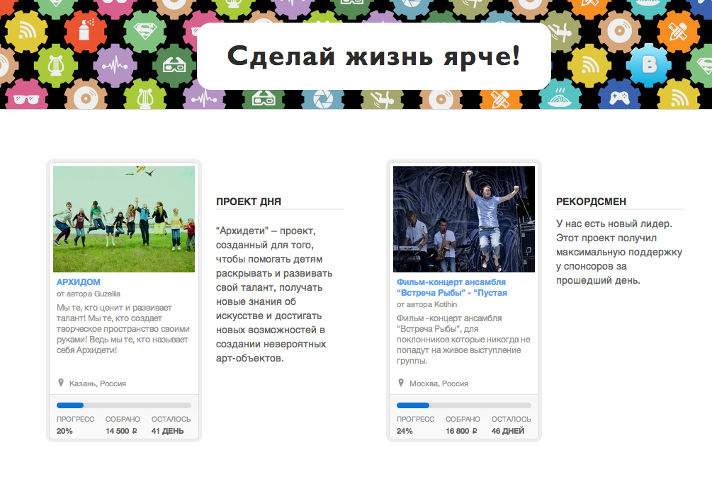 Е.Г.: Кураторы не платят авторам. Они помогают проектам собрать необходимые средства с помощью своего медийного ресурса. Например, мы работаем с «Вести.ру». На их сайте периодически появляются сообщения с информацией о каких-то инициативах. Дальше пользователь читает материал, переходит по ссылке на страничку с проектом и может его профинансировать. Для компаний-кураторов это возможность быть сопричастными к творческому краудфандингу.
