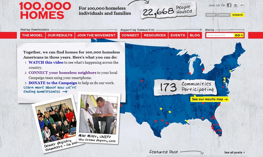 «100 000 Homes Campaign» – национальный проект, курируемый «Community Solutions», объединяет сообщества по всей стране для решения этой острой социальной проблемы. Руководители программы намерены обеспечить постоянным жильем 100 000 бездомных к июлю 2014 года. Имея за плечами 20-летний опыт разработки решений по этому вопросу, они построили модель, обеспечивающую наиболее рациональное и эффективное взаимодействие всех ее участников.