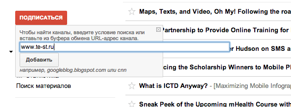 Для того, чтобы добавить в свой «ридер» интересующий вас сайт, нужно вбить его адрес в поисковое поле – оно появится, если вы нажмете на красную кнопку «Подписаться». Иногда RSS-адрес источника определить затруднительно – о том, как это сделать, можно прочитать в инструкции.