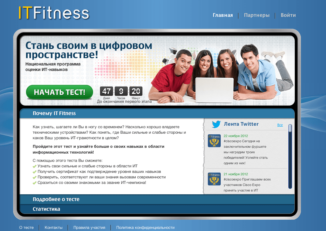 IT-Fitness – это специальная программа, разработанная при содействии Cisco, ОАО «МТС», АФК «Система», Московского технологического институт и многих других компаний, представляющая собой набор из 30 вопросов, ответив на которые, вы узнаете свой уровень IT-грамотности.