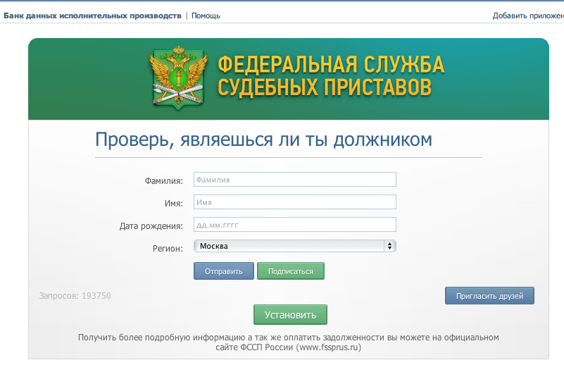 Федеральная служба судебных приставов (ФССП) выпустила новое приложение для социальных сетей с целью популяризации банка данных исполнительных производств официального сайта ФССП России. Теперь пользователи Вконтакте и Одноклассники могут найти себя, своих друзей и знакомых, используя обычную форму.
