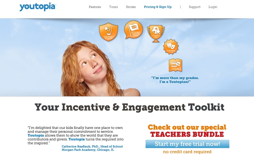 «Youtopia» – это онлайн-платформа, использующая игровые механики и широкий набор опциональных возможностей, с помощью которых школьные учителя, преподаватели и руководители персонала могут создавать для групп игроков самые разные задания. Дух соперничества неизбежно толкает пользователей к благим делам и саморазвитию, ведь за каждый положительный поступок они получают призовые очки, в то время как организаторы полностью контролируют процесс, отмечая успехи своих воспитанников.