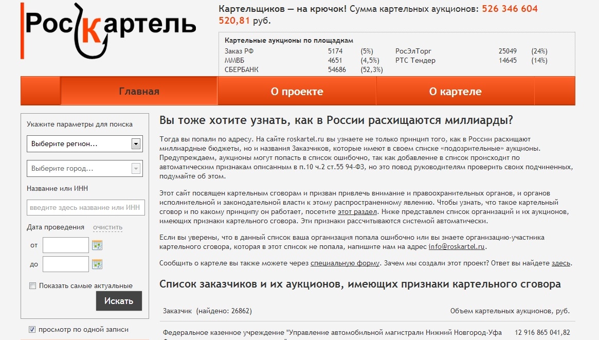«Роскартель» — это список длиной более чем 100 страниц с названиями организаций, потенциально замешанных в коррупционных схемах. Сайт посвящен государственному заказу – одному из самых главных источников отмывания денег, через который проходят миллиарды бюджетных средств.