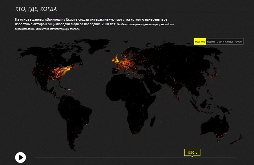 Esquire всегда отличался оригинальностью выбранных сюжетов, и в своем новом амплуа создателя приложений он выглядит по-прежнему интересно. «Кто, Где, Когда» – новый проект журнала, представляющий собой интерактивную карту, созданную на основе все той же Википедии.