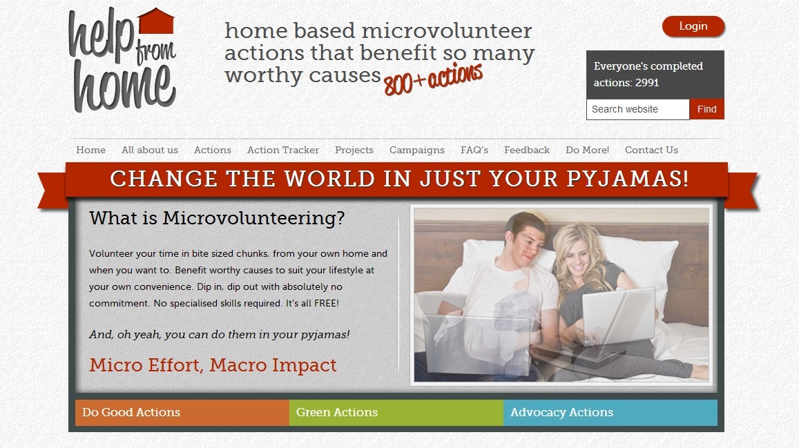 «Help from home» – некорпоративная ассоциация, являющаяся лишь посредником в микроволонтерской деятельности, своеобразным координационным центром. Все доступные для пользователей задания разбиты на категории, и к каждому из них прилагается описание, критерий времени, необходимого для его выполнения (не больше 30 минут), а также «пижамный» рейтинг, означающий буквально, сможете ли вы выполнить задание в любых удобных для вас условиях. По прилагающейся ссылке вы можете перейти к соответствующему приложению или на сайт сторонней организации, чтобы выполнить задание.