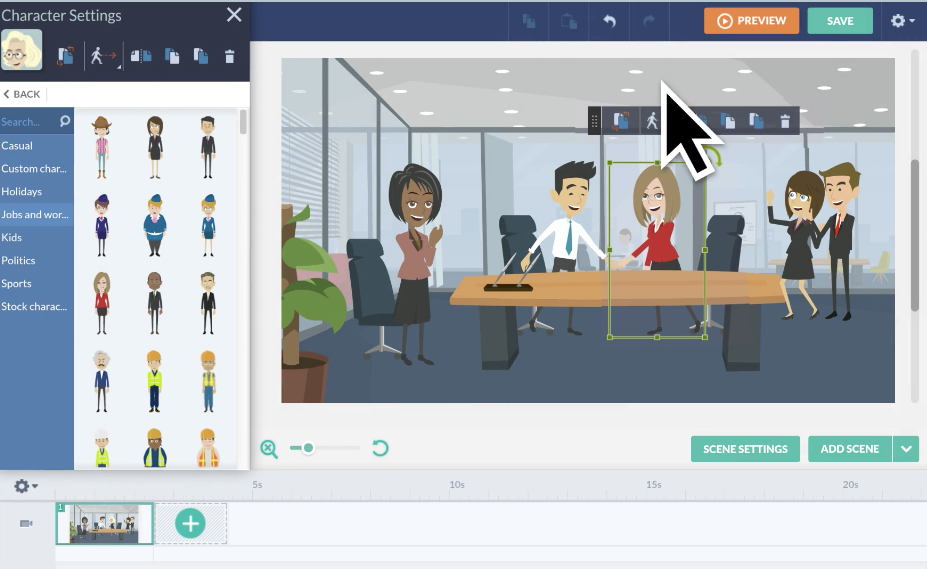 Для выбора и добавления в вашу сцену разных персонажей, звуков, текстов и других элементов служит левая панель, разделенная на несколько вкладок по категориям контента. Вы просто выбираете нужный элемент и перетаскиваете его в рабочую область. При выделении какого-либо предмета тут же появляется окно его свойств, в котором вы можете изменить его внешний вид, размер, текст и другие характеристики. Длительность отображения разных сцен, момент появления и исчезновения разных персонажей и предметов настраивается на монтажной ленте, расположенной в нижней части окна редактора.