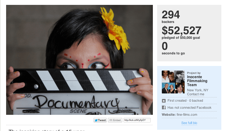 INOCENTE – фильм о художнице, живущей на улице без документов в свои 15 лет, собравший больше 50 000 долларов на краудфандинговой платформе Kickstarter, получил премию Оскар в номинации «короткометражный документальный фильм».