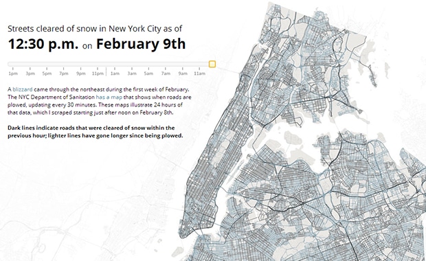 Ранее, Нью-Йорком продвигалось использование платформы PlowNYC для отслеживания прогресса в очистке занесенных во время снегопада «Nemo» дорог, а разработчик Derek Watkins использовал имеющиеся данные для визуализации расчистки снежных завалов в течении 24 часов.