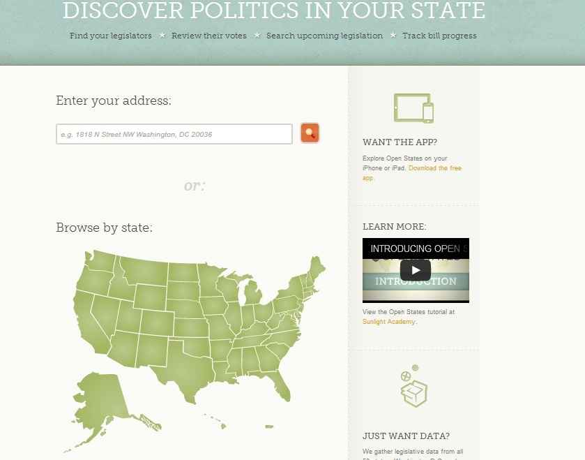 «Open States» – это бесплатный гражданский сервис, отслеживающий все новости законотворчества в США и представляющий их в удобном для рядовых пользователей виде. С помощью ресурса можно узнать состав государственного органа любого из пятидесяти штатов, изучить рассматриваемые и уже принятые законы, ознакомиться с позицией народных представителей и ходом голосования.