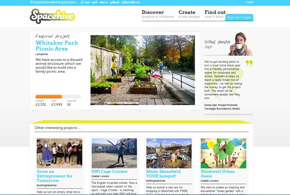 «Spacehive» – это краудфандинговая платформа, функционирующая в Великобритании для улучшения городов и воплощения инициатив горожан на микроуровне.