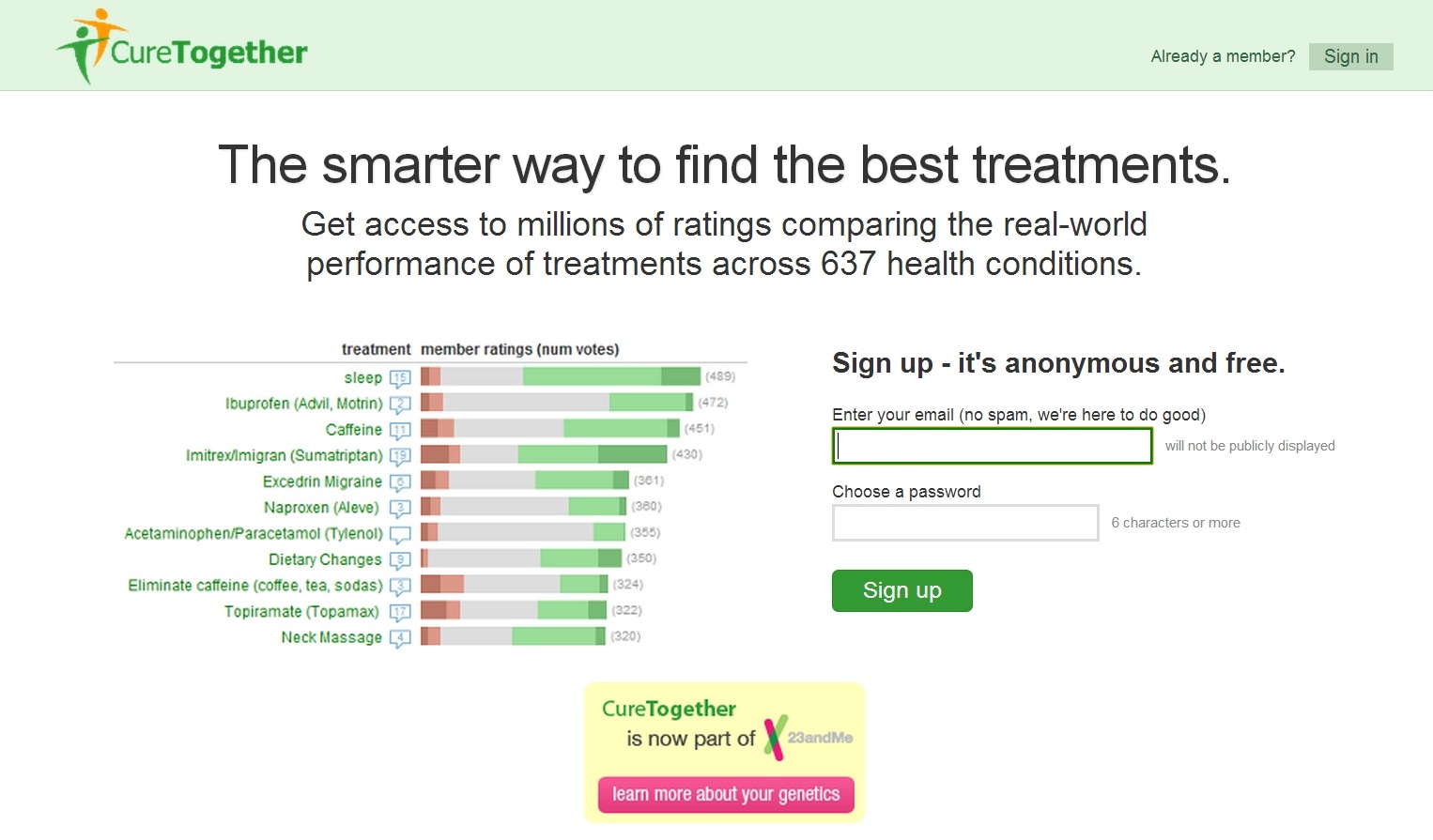 «CureTogether» предоставляет пользователям полный набор инструментов для заполнения информации о режиме и переменах в состоянии здоровья. Все вводимые данные являются конфиденциальными проект полностью сохраняет вашу анонимность. 25 000 пользователей из 112 стран зафиксировали более трех миллионов показателей. Однако главная ценность «CureTogether» это личный опыт пациентов, их собственные истории изменившейся жизни.