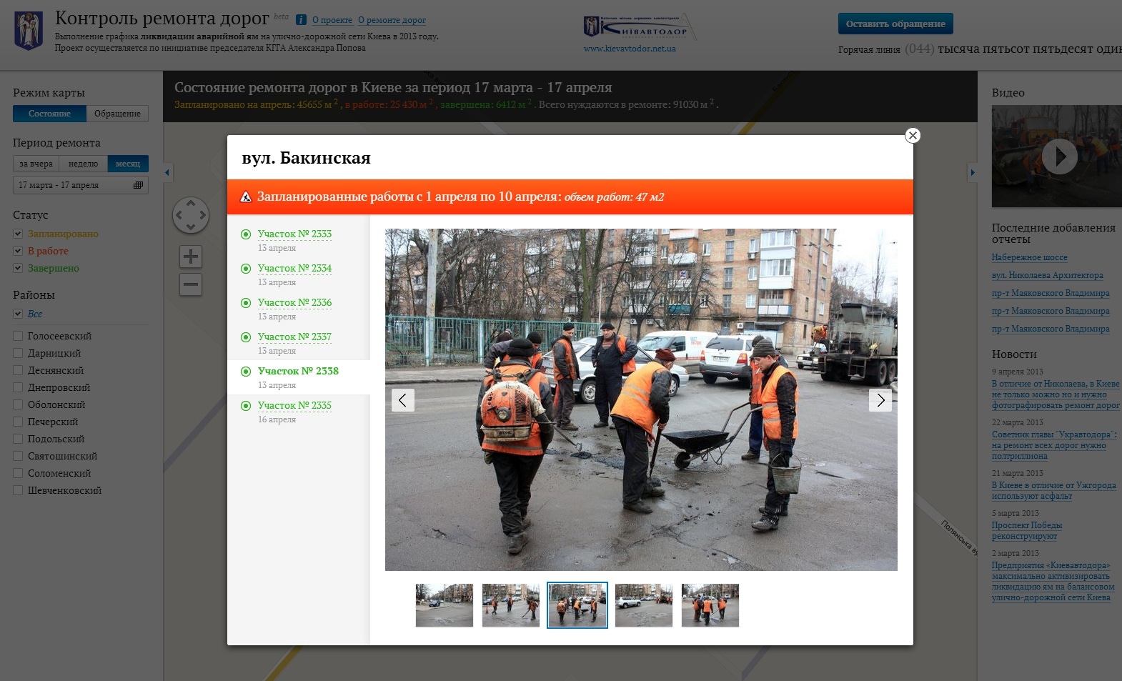 19 февраля 2013 года городская администрация Киева во главе с Александром Поповым объявила о запуске Программы ликвидации ям на улично-дорожной сети столицы. Ремонт дорог – тема щепетильная, связанная с гигантскими расходными строками бюджета и частыми нарушениями – гражданские контролирующие приложения оказываются тут весьма кстати. На этот раз инициативы со стороны активистов ждать не пришлось – власти сами открыли сайт для общественного контроля ремонтных работ.