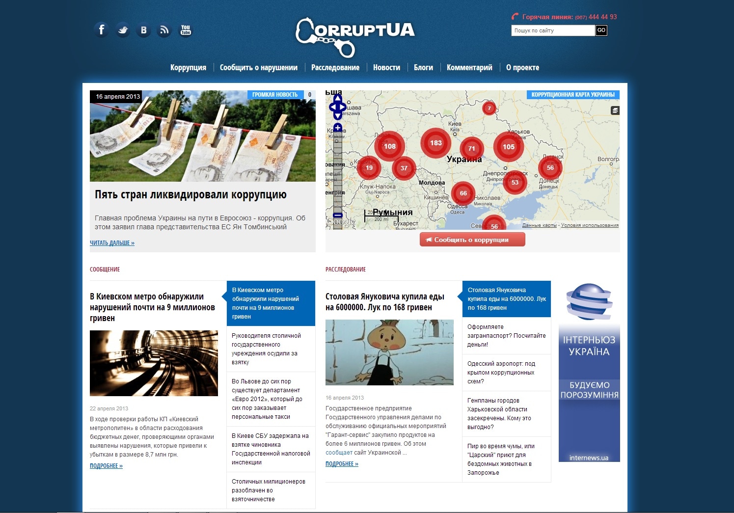 Проект был инициирован организацией «Интерньюс-Украина» при поддержке посольства Нидерландов. Карта, построенная на базе «Ushahidi» знакома всем, кто имел дело с похожими краудсорсинговами проектами. Тут и стандартный набор опций, и те же варианты заполнения данных (специальная форма, письмо на электронную почту и т.д.), но есть и заметные отличия в работе ресурса. Самое главное заключается в том, что модераторы проверяют поступившие сообщения на ложность информации, что нехарактерно для антикоррупционных сервисов. Не совсем понятно, какие критерии достоверности они используют, но есть вероятность, что ваш отчет не будет отмечен на карте.