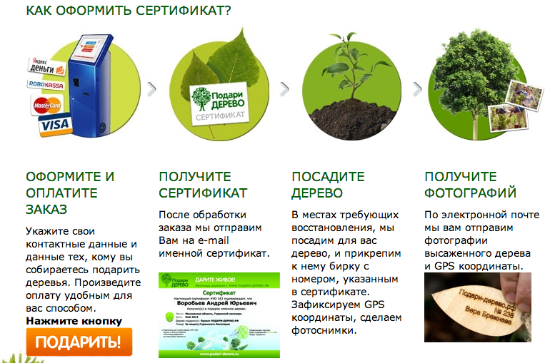Все происходит очень просто. Волонтеры сажают деревья, присваивают им номера, отмечая их соответствующей табличкой, замеряют точные GPS координаты, все эти данные сохраняются в системе. При покупке сертификата, пользователь получает дерево с индивидуальным номером, координатами, фотографиями процесса высадки и красивым именным сертификатом, который при желании может распечатать и повесить на стену в рамочку.