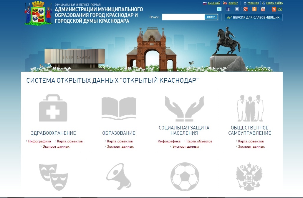 Краснодар не раз занимал верхние строчки различных рейтингов городов России, в том числе и как лучший город для проживания. Продолжает он держать марку и в Интернет-пространстве, о чем свидетельствует главный городской портал, содержащий многочисленные интерактивные элементы и открытые данные.