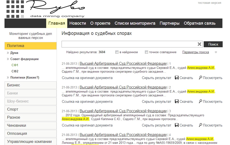 - Отслеживать все судебные дела, касающиеся одного субъекта и рассматриваемые в судах общей юрисдикции и арбитражных судах, на одном сайте. Такой возможности нет на государственных судебных сайтах (ГАС “Правосудие”). Если вы не знаете заранее, в каком районном суде общей юрисдикции рассматривается дело какого-либо гражданина или фирмы, вам придется перебрать поиск по всем 2200 таким судам отдельно, тогда как RYBO позволяет провести однократный сквозной поиск.