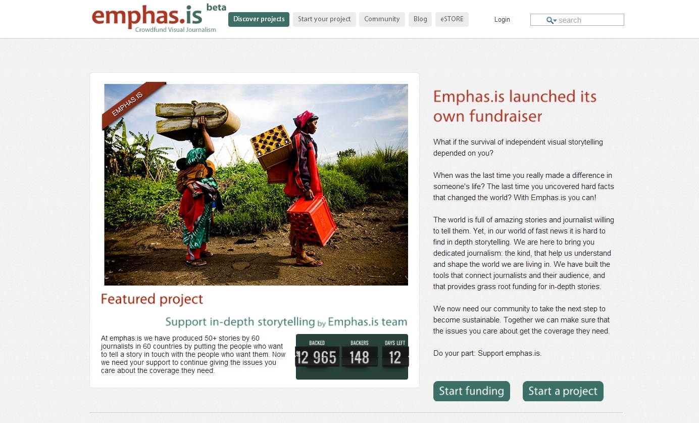 «Emphas.is» – это первый краудфандинговый сайт, посвященный фотожурналистам. Будучи узко специализированным сегментом «Kickstarter», он использует уже проверенную годами модель: зарегистрированные участники отправляют заявки с описанием своего проекта, и в случае его допуска, пользователи начинают жертвовать на него деньги.Таким образом, журналисты могут собрать за короткий срок требуемую сумму денег и отправиться в любую точку мира.