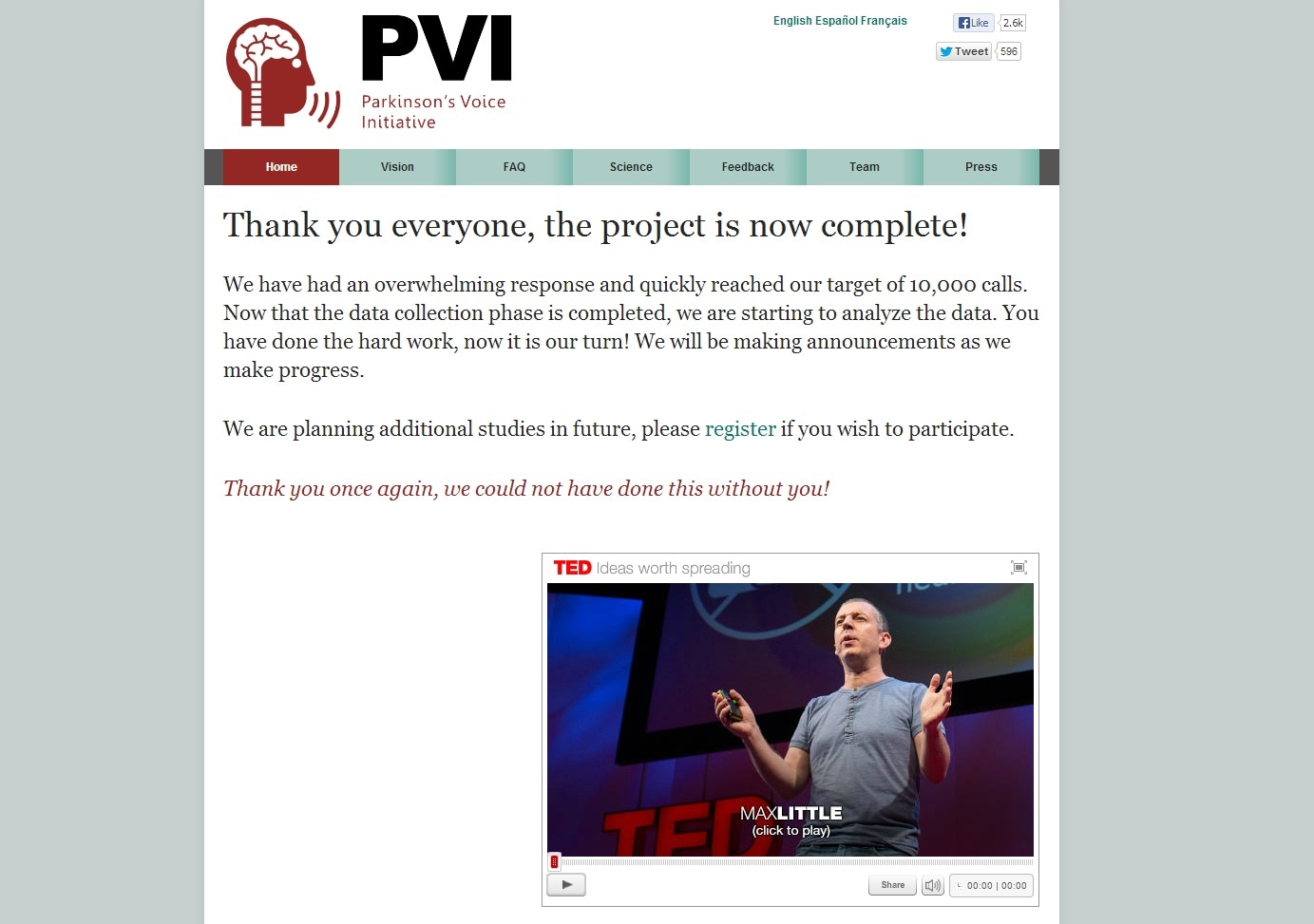 Для продолжения исследования требовались новые данные, и тогда разработчики обратились к широкой публике. На конференции TEDex был представлен проект «PVI» – «Parkinson’s Voice Initiative». Доктор Литтл призвал людей пройти небольшой голосовой тест. Для этого нужно было позвонить по телефонному номеру и потратить не более 7 минут своего времени, сказать “ААААА” и выполнить еще несколько простых заданий. Алгоритмы позволяют вычислять симптомы путем анализа полученной записи на предмет тремора, хрипоты и слабости в голосе. К участию в проекте привлекались не только больные Паркинсоном, но и здоровые люди из 10 стран. Всего планировалось собрать 10000 записей за 6 месяцев, и уже в первый месяц было собрано более 5 000.