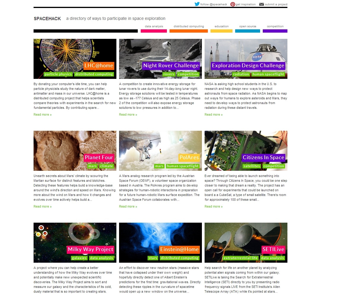 Так же как и «Mesh Cities» ресурс Spacehack собирает в одном месте проекты общей тематики но разного содержания. Отличие состоит в том, что в каждом из них пользователь может принять участие: исследование просторов космоса, наблюдение за небесные телами, робототехника… участники могут посетить виртуальный мастер-класс по строительству собственного телескопа.