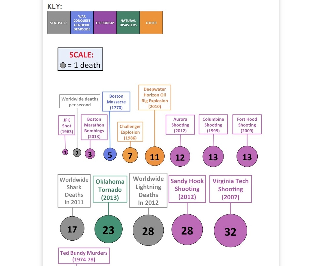 «Wait but why» представил в виде инфографики статистику смертности, вызванной крупнейшими войнами, террористическими актами и стихийными бедствий. Встречаются и специфичные данные — например, количество погибших на горе Эверест.