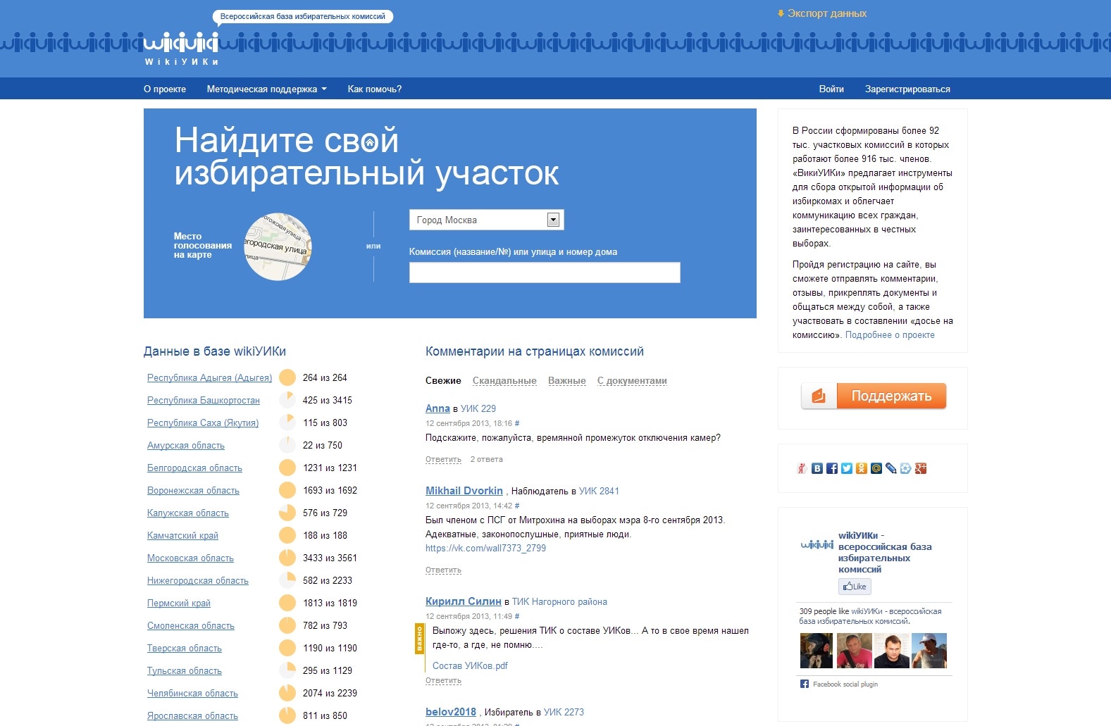 Российская система избирательного права претерпела некоторые изменения в последние годы: участковые комиссии, которых насчитывается более 92 тысяч, формируются теперь на более долгий срок, вплоть до федеральных выборов 2016 и 2018 гг. Таким образом, граждане могут анализировать составы УИКов, отслеживать качество их работы и т.д. Однако для полноценного мониторинга необходима центральная база данных, которая содержала бы актуальную информацию по избирательным участкам во всех регионах страны – этой базой стал ресурс «ВикиУИКи», участники которого выступают не только в роли пользователей информации, но и сами дополняют ее нужными данными.
