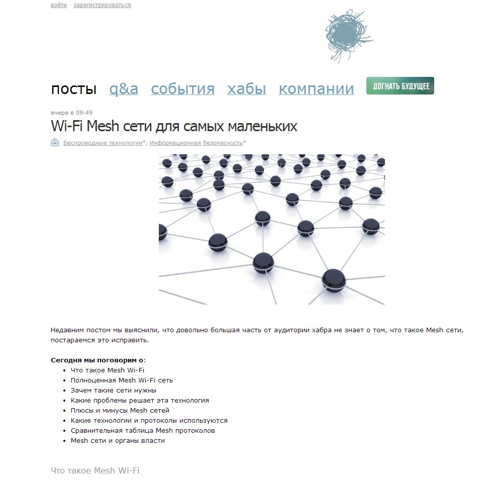 Хабрахабр опубликовал статью, знакомящую читателя с основными характеристиками Mesh-сетей, их отличительными особенностями. В обзоре рассмотрены преимущества и недостатки, сравниваются различные протоколы для организации Mesh-сетей и поднимается вопрос об их взаимоотношениях с органами власти. На вопросы о том, какое будущее ждёт набирающую популярность технологию в России, и есть ли у нее настоящее вы ответите сами, изучив материал.