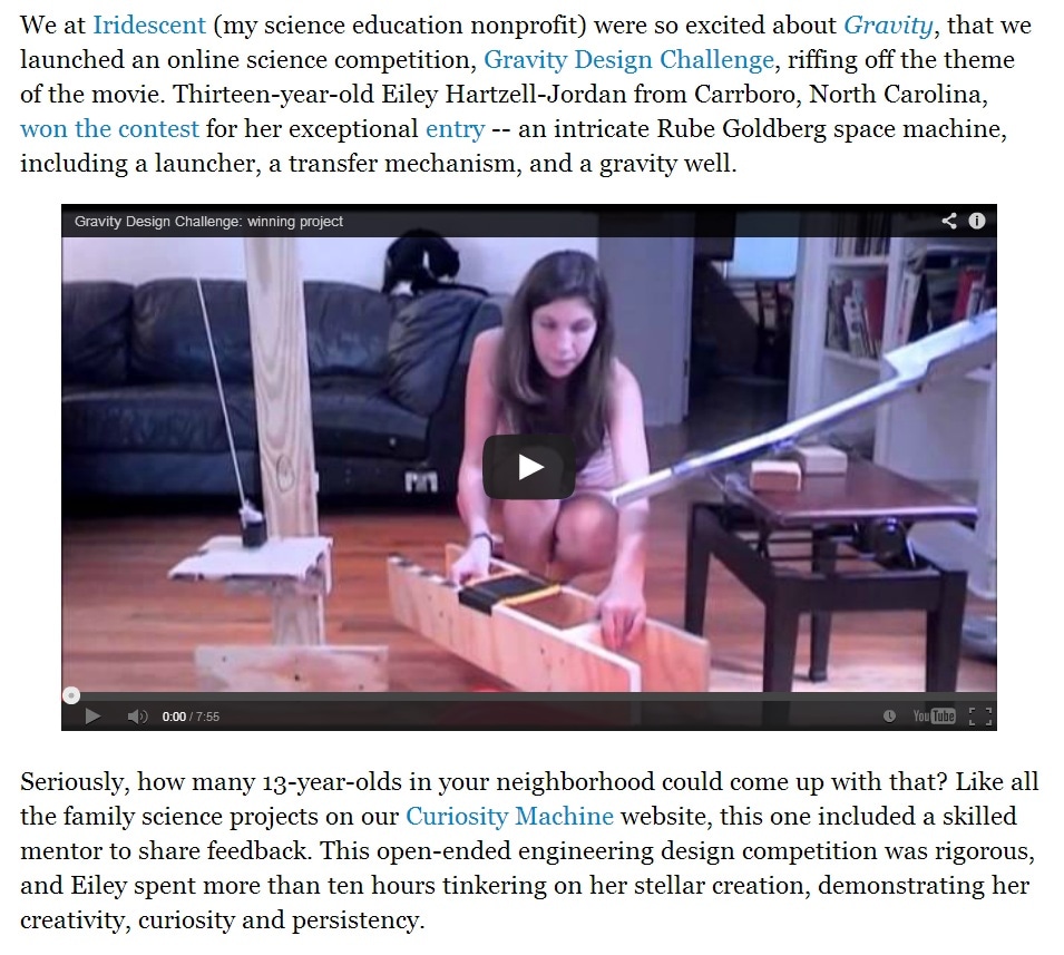 Вашему вниманию предлагается видео победительницы конкурса Gravity Design Challenge, 13-летней Эйли Хартзил-Джордан (Eiley Hartzell-Jordan), в котором она презентует свой проект. Что толкает юных девушек к подобным изобретениям, решил разобраться TheHuffington Post (статья на английском языке).