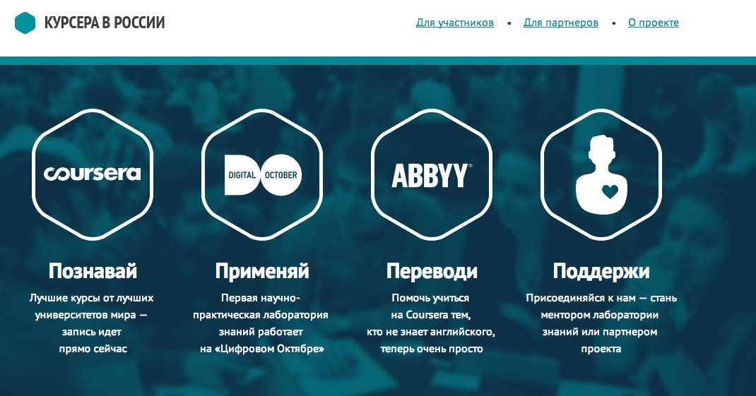Первая лаборатория знаний (хаб) Coursera открывается в Digital October Center. Занятие студентов, выбравших онлайн-курс «Алгоритмы в биоинформатике» состоится уже 20-го ноября. Информацию о расписании других курсов смотрите на сайте Digital October.
