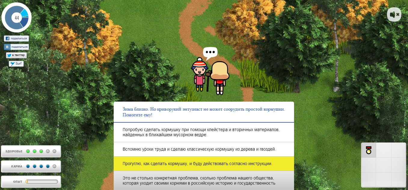 С помощью игры можно побывать в роли волонтера и проверить свои волонтерские навыки в игровом мире, герои и задания в котором, впрочем, очень похожи на настоящие: криворукие энтузиасты, которые не могут сделать скворечник, кот, которому нужно помочь спуститься с дерева, задачи о том, как раздельно выбросить мусор и чем нарисовать велодорожку — это неполный список квестов, с которыми предстоит столкнуться волонтеру в игре.