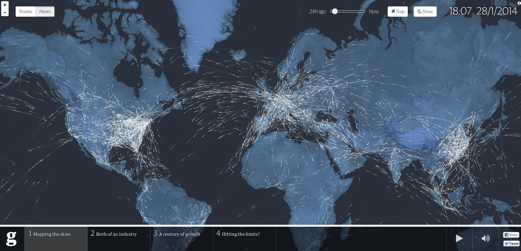 К столетию истории пассажирской авиации британское издание The Guardian совместно со студией Kiln запустили визуальный интерактивный проект «In Flight» − настоящий шедевр в области визуализации больших данных.