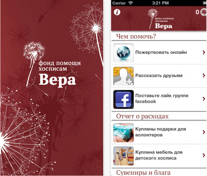 Недавно представители фонда помощи хосписам «Веры» объявили о запуске мобильного сервиса. C его помощью владельцы смартфонов могут вносить пожертвования с банковской карты или со счета телефона, получая взамен призовые баллы-одуванчики. По мере накопления баллов их можно будет обменять на ценные призы от самого фонда и его партнеров, в число которых войдут кафе, рестораны, театры и другие места досуга.