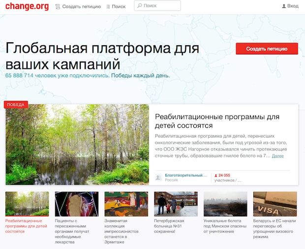 Change.org − это глобальная платформа, предоставляющая людям в России и во всем мире возможность отстаивать свои права, начинать кампании, добиваться от властей поддержки общественных инициатив и тем самым осуществлять в жизни те перемены, которые вы считаете необходимыми.