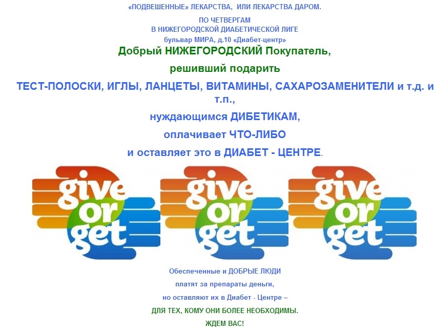 Нижегородская диабетическая лига решила продолжить эту добрую традицию и начала раздавать «подвешенные» лекарства. Акция получила название «Чистый Четверг» — именно в этот день недели нуждающиеся могут получить бесплатно тест-полоски, иглы, ланцеты, витамины, необходимые препараты в Диабет-центре.