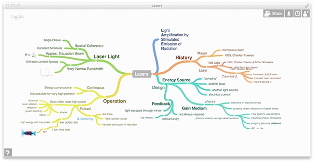 MindMeister — это простой инструмент, доступный как онлайн веб-приложение или в версии для смартфонов (Android, iOS), цена начинается с 4.99$ в месяц (но сначала вы можете воспользоваться бесплатной пробной версией). С помощью этого инструмента вы можете совместно работать над проектами с друзьями и коллегами в режиме реального времени.