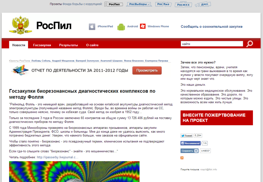 Проект «РосПил» – это общественный проект Фонда борьбы с коррупцией* (признан в России иноагентом, а также экстремистской организацией и запрещен), направленный на контроль за расходованием бюджетных средств в сфере государственных и муниципальных закупок, закупок госкомпаний. Финансируется полностью за счет добровольных пожертвований граждан: за два года работы проекта собрано более 10 млн. руб. Сумма контрактов заказов, по которым удалось пресечь нарушения закона за два года работы, превышает 59 млрд. рублей.