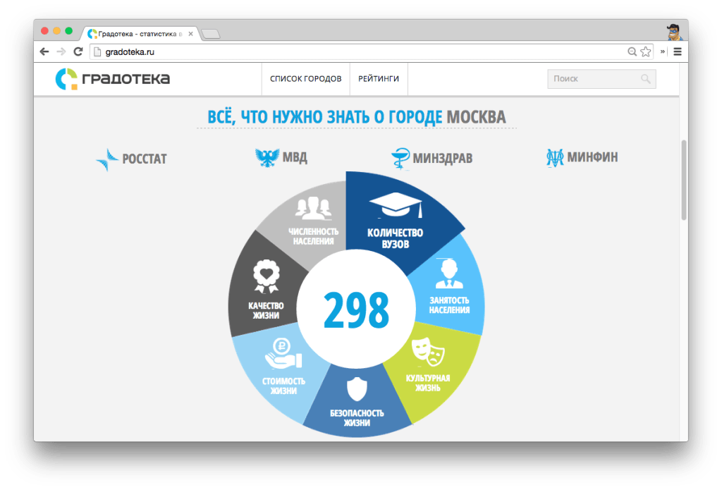 С помощью ресурса можно узнать данные о каждом городе либо посмотреть рейтинги городов России по разным параметрам. Данные о городе имеют множество категорий, а также ссылки на источники данных.