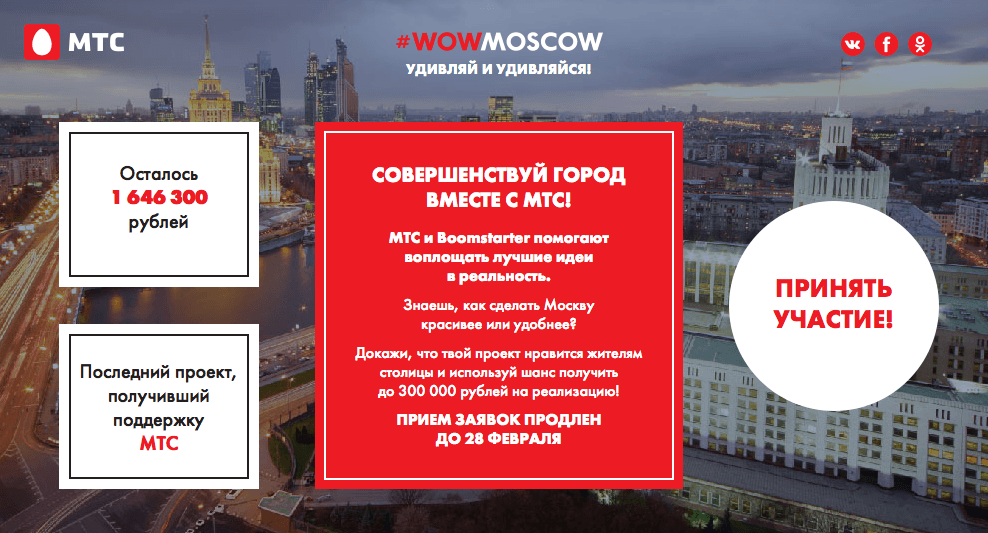 Для тех, кто знает, как сделать Москву красивее и удобнее, МТС и Boomstarter помогут воплотить лучшие идеи в реальность. Прием заявок продлен до 28 февраля.