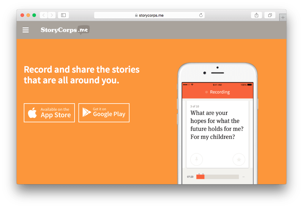 Новое мобильное приложение StoryCorps поможет в проведении интервью благодаря размещению вопросов на экране при записи. Также есть возможность загрузить готовый аудиофайл в общую библиотеку и поделиться интервью с помощью ссылки.